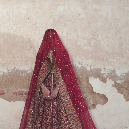 This beautiful deep burgundy piece is the epitome of elegance. Intricately handworked with resham,kamdaani and Dapka details, this piece is a comfortable wear while simultaneously echoing grandeur and regality. Paired with a heavy dupatta with detailed French knots and kamdaani work, this bridal is sure to be an heirloom piece to be worn and enjoyed by generations to come.